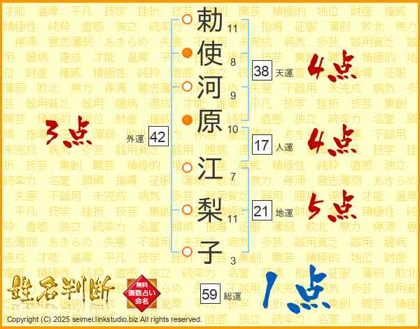 勅(11画)使(8画)河(9画)原(10画)  江(7画)梨(11画)子(3画)