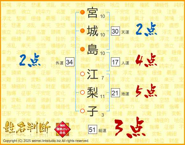 宮(10画)城(10画)島(10画) 江(7画)梨(11画)子(3画)