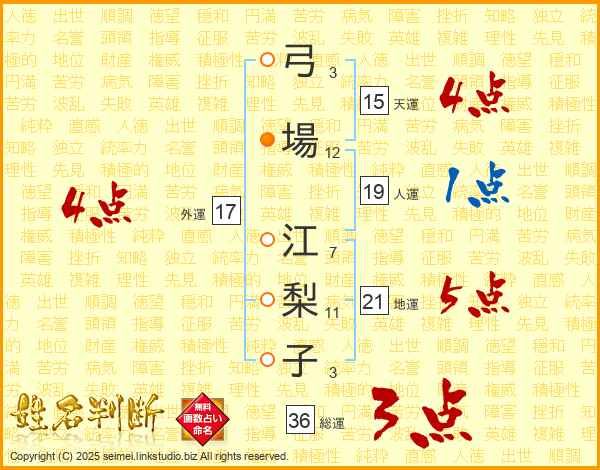 弓(3画)場(12画) 江(7画)梨(11画)子(3画)