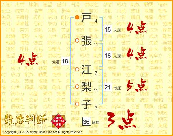 戸(4画)張(11画) 江(7画)梨(11画)子(3画)
