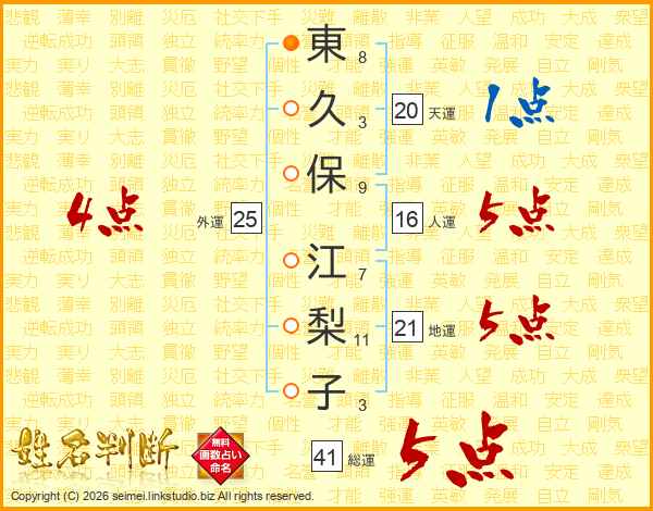 東(8画)久(3画)保(9画) 江(7画)梨(11画)子(3画)