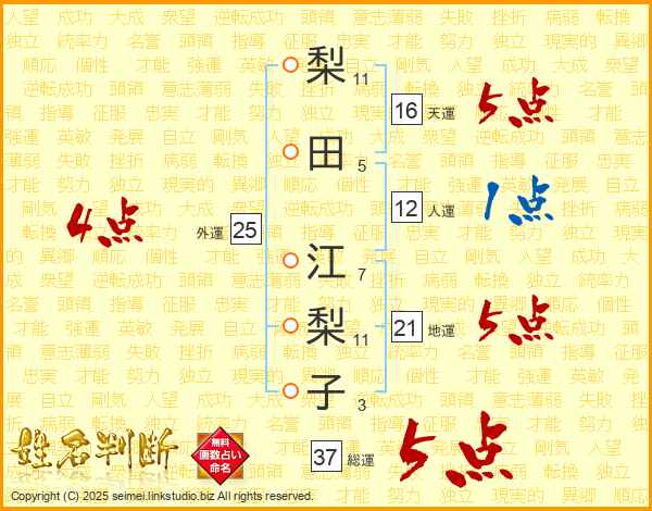 梨(11画)田(5画)  江(7画)梨(11画)子(3画)