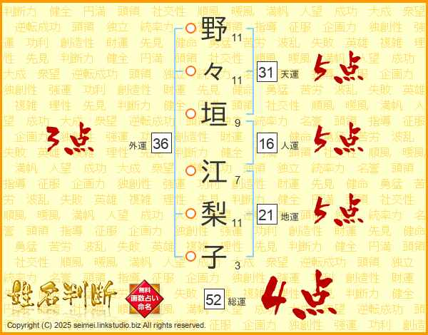 野(11画)々(11画)垣(9画) 江(7画)梨(11画)子(3画)