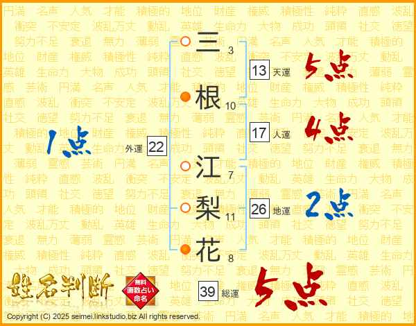 生活面を象徴する運勢です。外部から受ける影響力を表し、結婚運、家庭運や職場、環境への順応性を表します。総運から人運を引いた画数。姓や名が1文字の場合を除く。