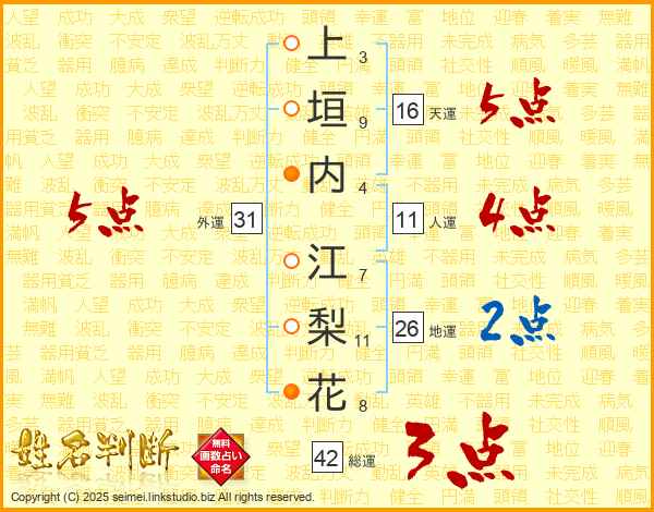 上(3画)垣(9画)内(4画) 江(7画)梨(11画)花(8画)