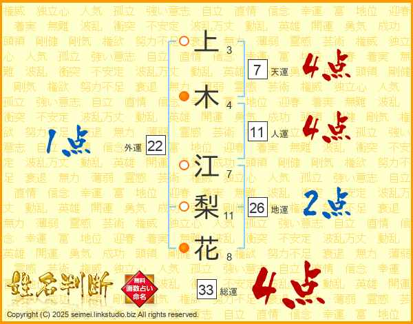上(3画)木(4画) 江(7画)梨(11画)花(8画)