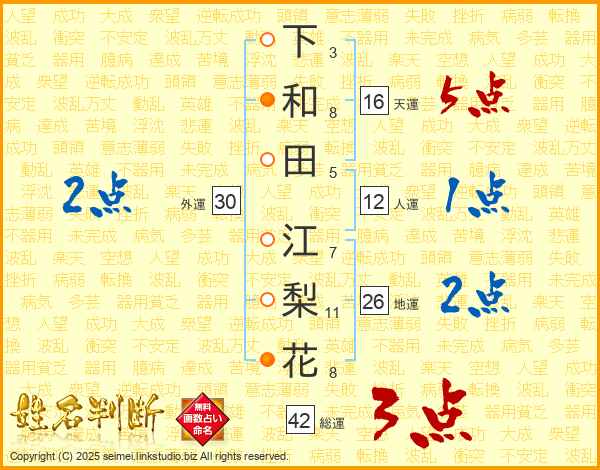 下(3画)和(8画)田(5画) 江(7画)梨(11画)花(8画)
