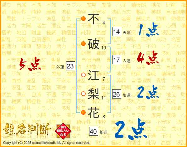 生活面を象徴する運勢です。外部から受ける影響力を表し、結婚運、家庭運や職場、環境への順応性を表します。総運から人運を引いた画数。姓や名が1文字の場合を除く。