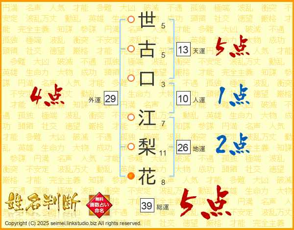 世古口江梨花さんの総運は39画の5点!