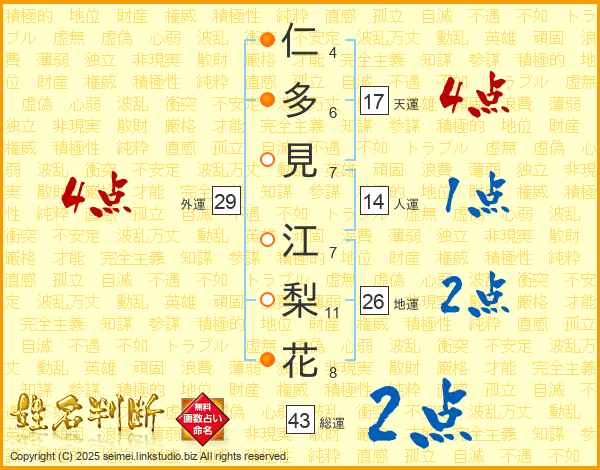 仁(4画)多(6画)見(7画) 江(7画)梨(11画)花(8画)