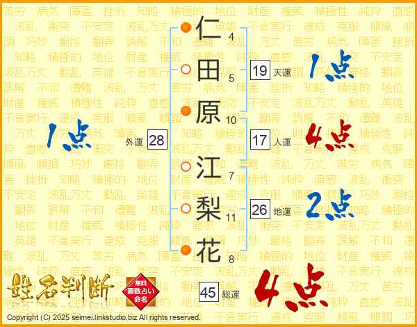 仁(4画)田(5画)原(10画) 江(7画)梨(11画)花(8画)