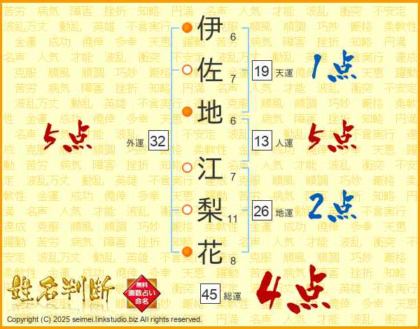 伊(6画)佐(7画)地(6画) 江(7画)梨(11画)花(8画)