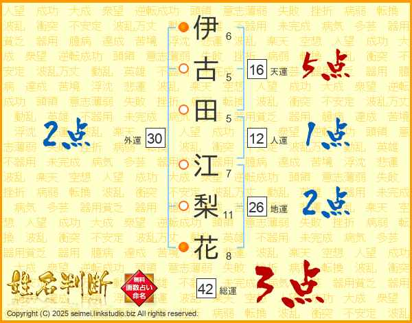 伊(6画)古(5画)田(5画) 江(7画)梨(11画)花(8画)