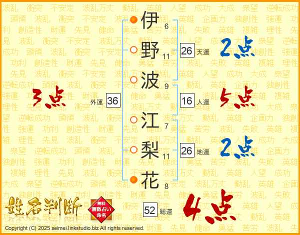 伊(6画)野(11画)波(9画) 江(7画)梨(11画)花(8画)