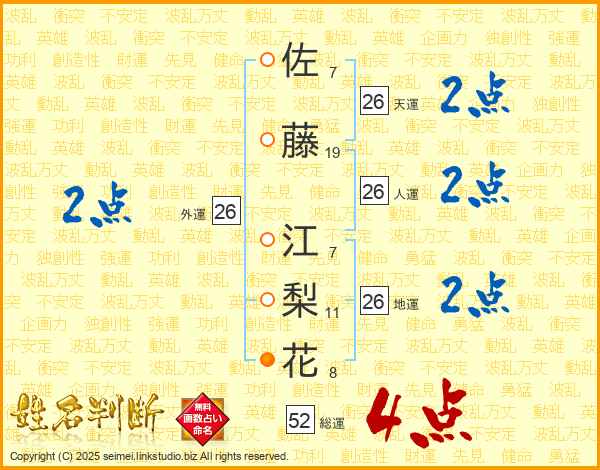 佐藤江梨花さんの総運は52画の4点!