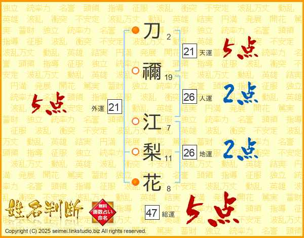 刀(2画)禰(19画) 江(7画)梨(11画)花(8画)