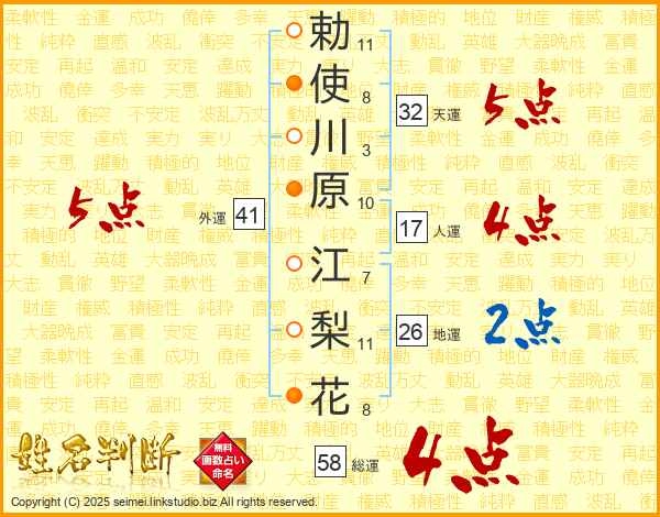 勅(11画)使(8画)川(3画)原(10画) 江(7画)梨(11画)花(8画)