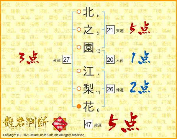 北(5画)之(3画)園(13画) 江(7画)梨(11画)花(8画)