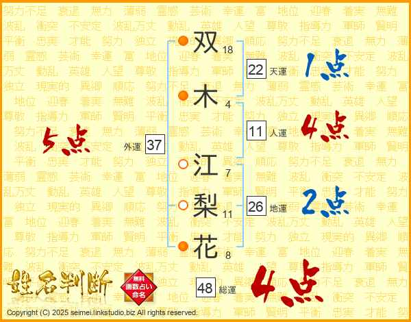 双(18画)木(4画) 江(7画)梨(11画)花(8画)