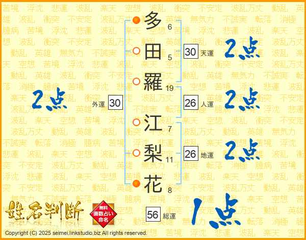 多(6画)田(5画)羅(19画) 江(7画)梨(11画)花(8画)
