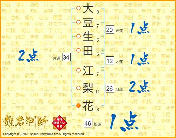 大(3画)豆(7画)生(5画)田(5画) 江(7画)梨(11画)花(8画)