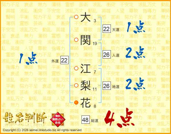 大(3画)関(19画) 江(7画)梨(11画)花(8画)