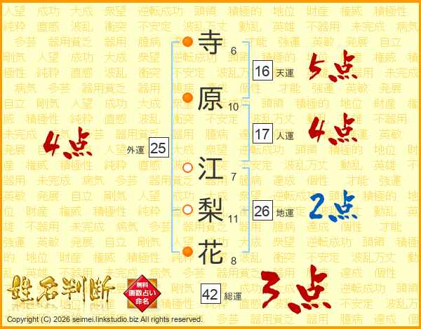 寺(6画)原(10画) 江(7画)梨(11画)花(8画)