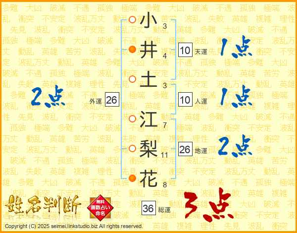 小(3画)井(4画)土(3画) 江(7画)梨(11画)花(8画)