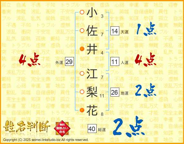 小(3画)佐(7画)井(4画) 江(7画)梨(11画)花(8画)
