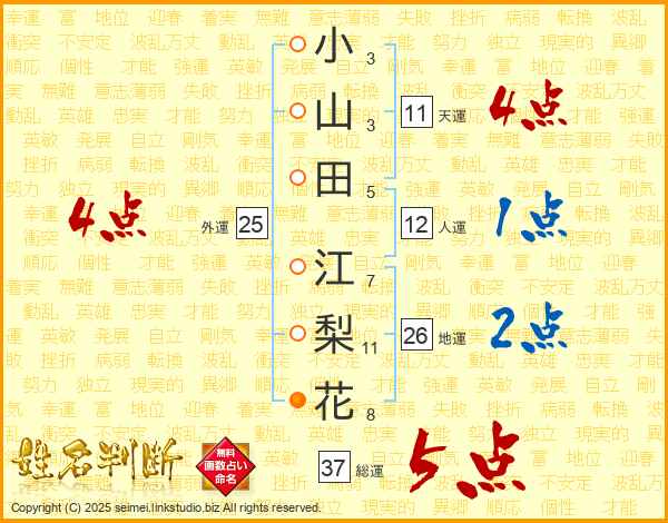 小(3画)山(3画)田(5画) 江(7画)梨(11画)花(8画)