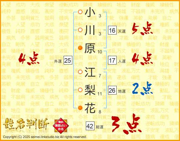 小(3画)川(3画)原(10画) 江(7画)梨(11画)花(8画)