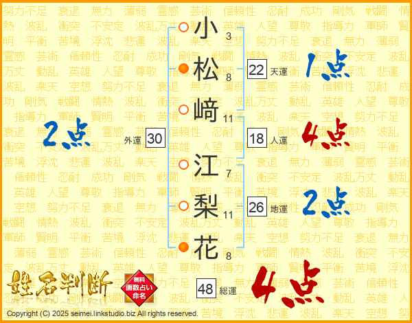 小(3画)松(8画)﨑(11画) 江(7画)梨(11画)花(8画)