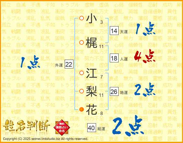 小(3画)梶(11画) 江(7画)梨(11画)花(8画)