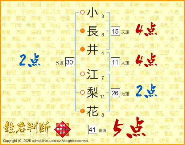 小(3画)長(8画)井(4画) 江(7画)梨(11画)花(8画)
