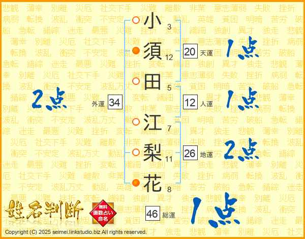 小(3画)須(12画)田(5画) 江(7画)梨(11画)花(8画)