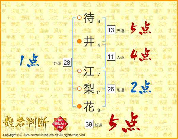 待(9画)井(4画) 江(7画)梨(11画)花(8画)