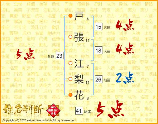 戸(4画)張(11画) 江(7画)梨(11画)花(8画)