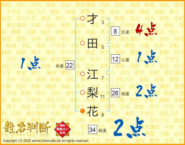 才(3画)田(5画) 江(7画)梨(11画)花(8画)