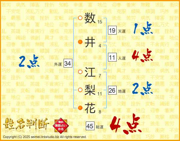 数(15画)井(4画) 江(7画)梨(11画)花(8画)