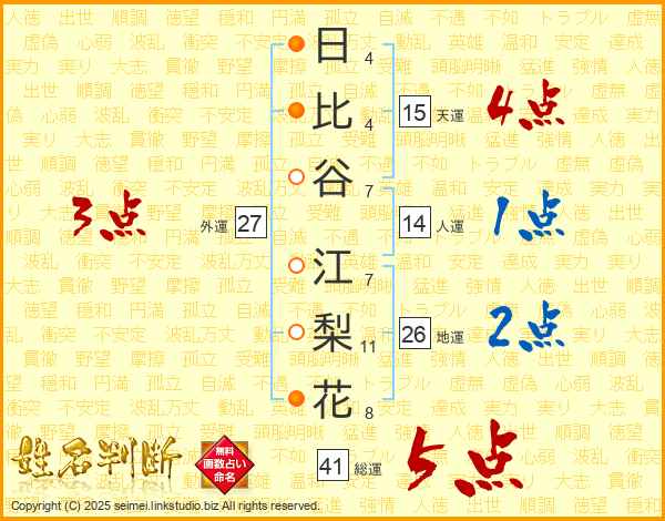 日(4画)比(4画)谷(7画) 江(7画)梨(11画)花(8画)