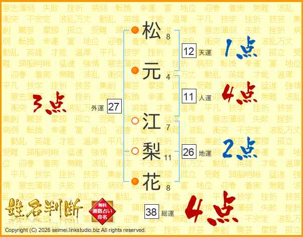 松(8画)元(4画) 江(7画)梨(11画)花(8画)