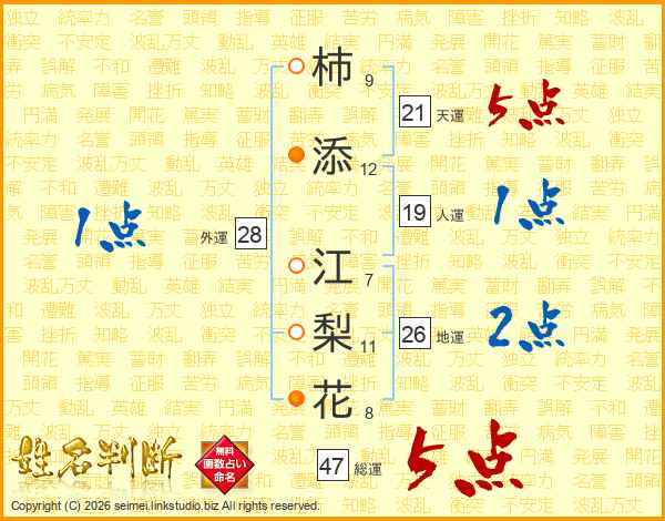 柿(9画)添(12画) 江(7画)梨(11画)花(8画)