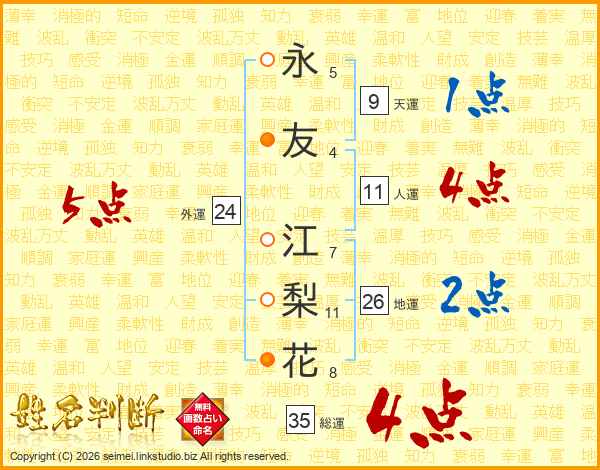 永(5画)友(4画) 江(7画)梨(11画)花(8画)
