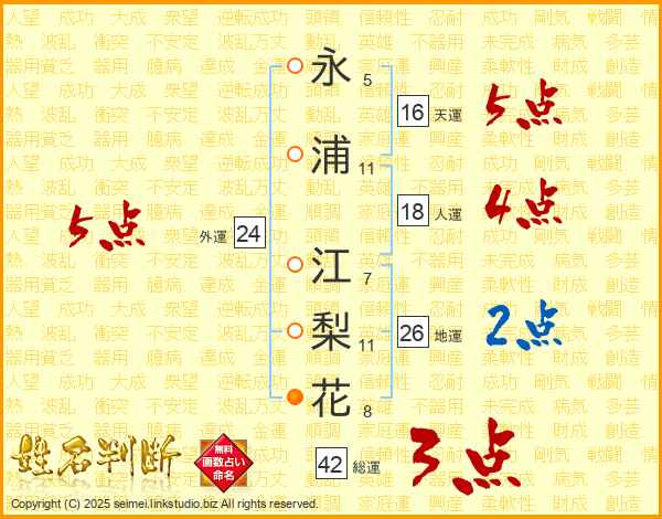永(5画)浦(11画) 江(7画)梨(11画)花(8画)