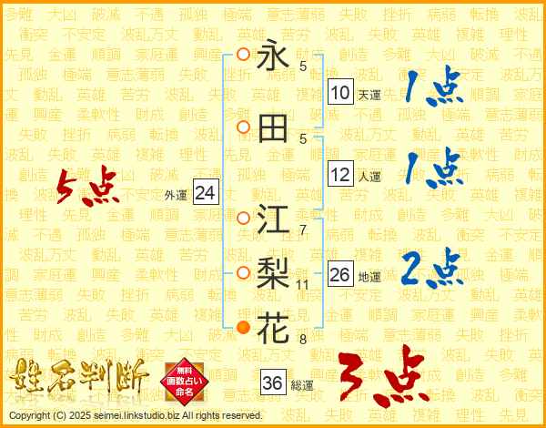 永(5画)田(5画) 江(7画)梨(11画)花(8画)