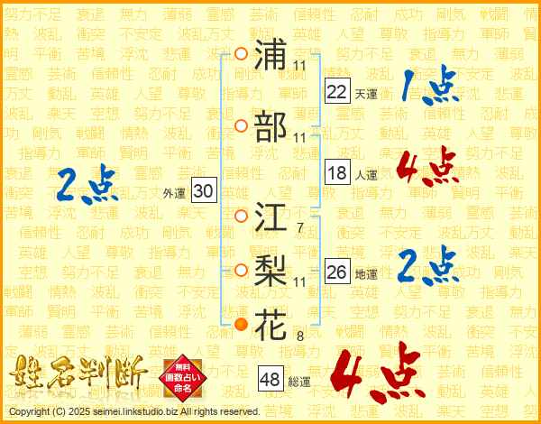 浦(11画)部(11画) 江(7画)梨(11画)花(8画)