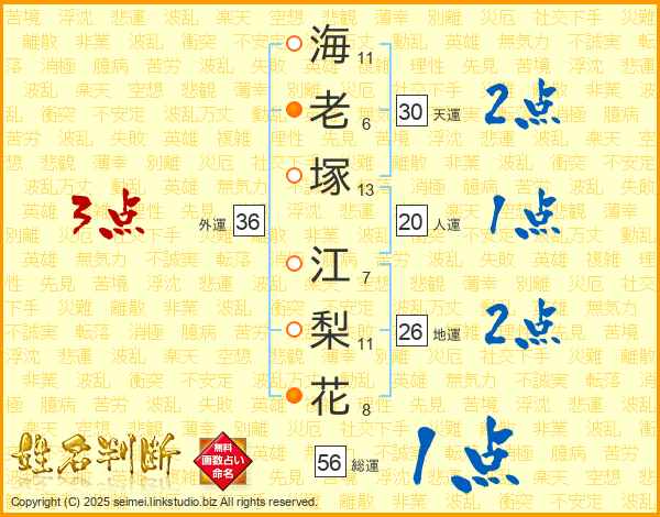 海(11画)老(6画)塚(13画) 江(7画)梨(11画)花(8画)