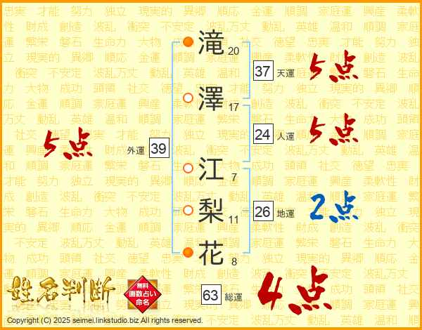 滝(20画)澤(17画) 江(7画)梨(11画)花(8画)