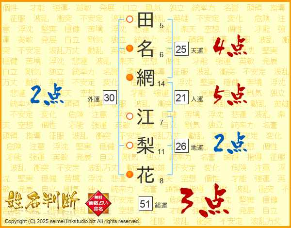 田(5画)名(6画)網(14画) 江(7画)梨(11画)花(8画)