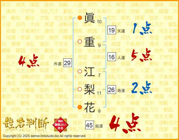 眞(10画)重(9画) 江(7画)梨(11画)花(8画)